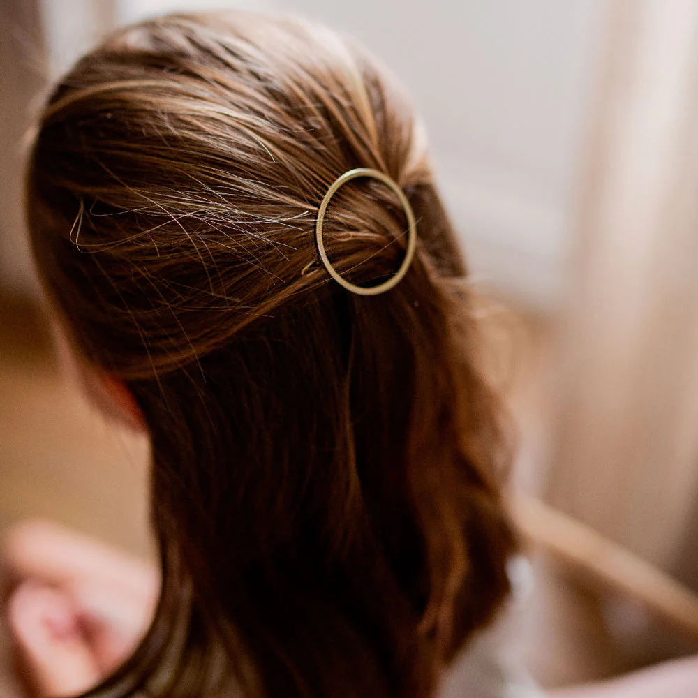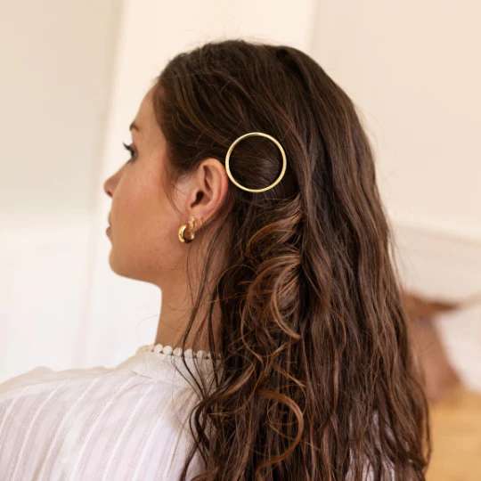 Ajoutez une touche de raffinement à vos coiffures avec la Barrette ronde dorée Bachca. Élégante et pratique, elle convient à toutes les occasions grâce à son design intemporel et sa fixation douce qui respecte vos cheveux.