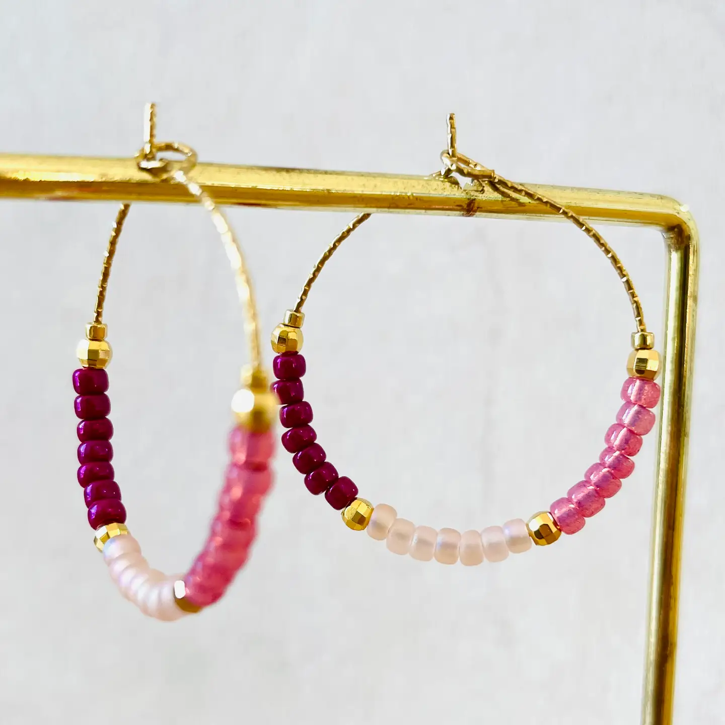 Les créoles miyuki rose et or apportent une touche douce et élégante à votre style. Les perles roses associées aux touches dorées créent un bijou lumineux et féminin qui s’accorde facilement avec toutes vos tenues.