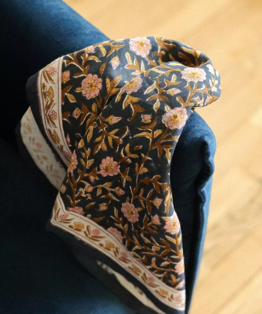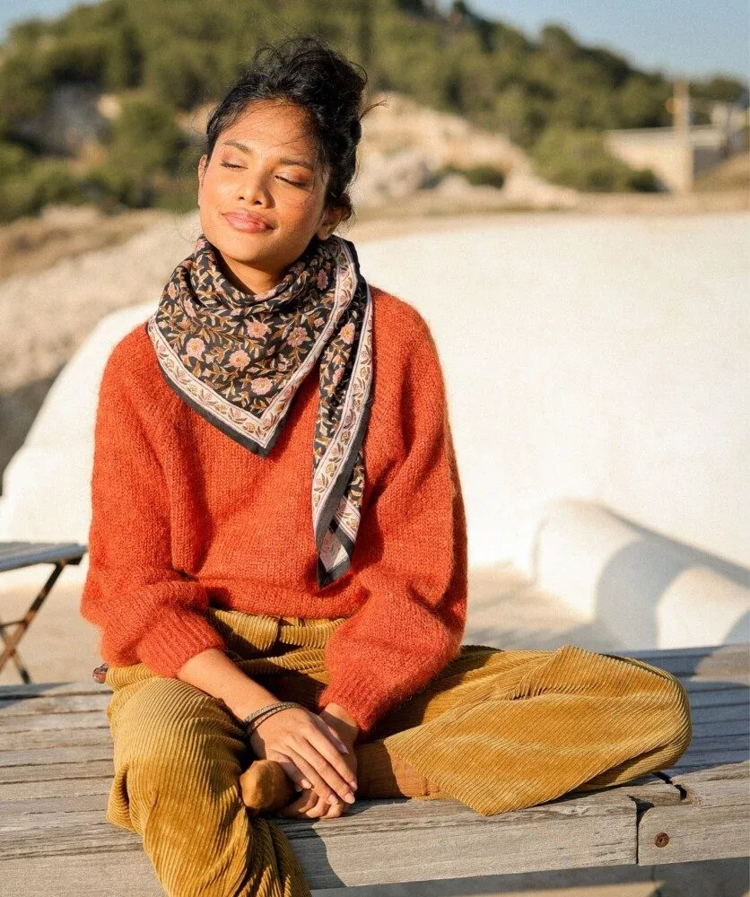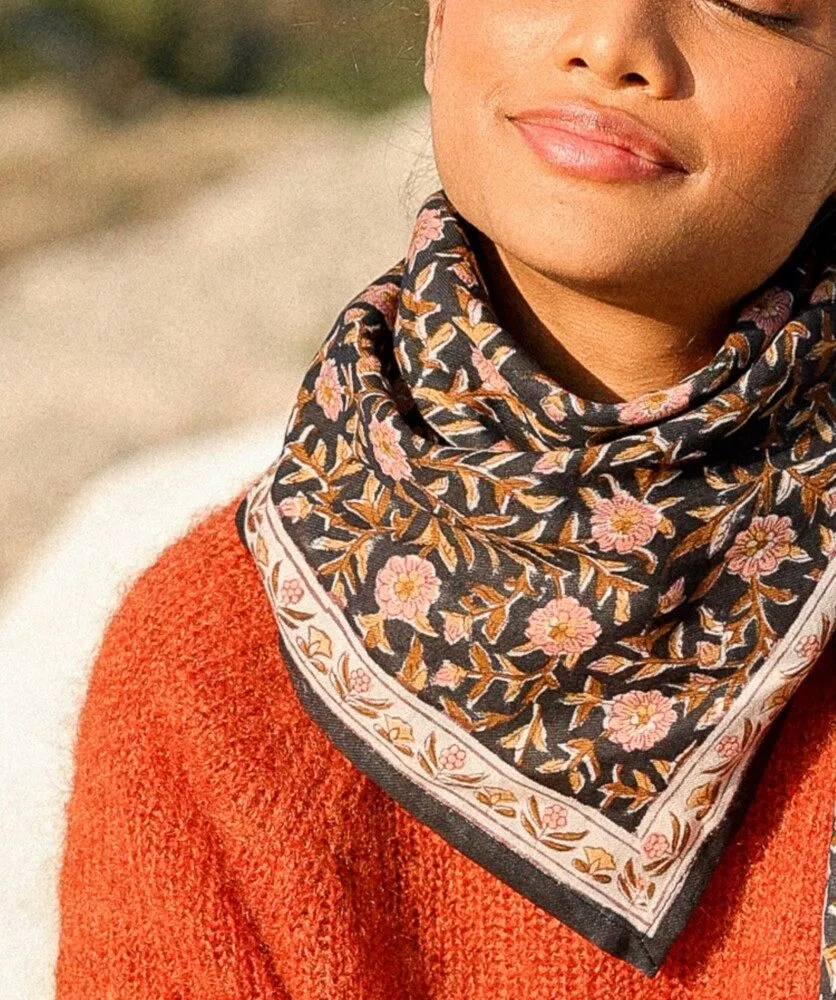 Le foulard est conçu en France, mais imprimé et confectionné en Inde, ce qui témoigne d’un engagement pour l’artisanat et le travail local. Chaque pièce est donc un peu différente, et ces petites variations rendent votre foulard vraiment unique.