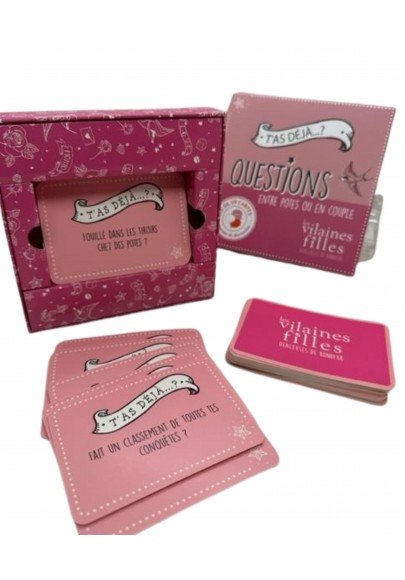 Le jeu “T’as déjà… ? – Vilaines filles” est un lanceur de discussions irrésistible pour mettre de l’ambiance dès les premières minutes. Drôle, décalé et un peu piquant, il invite chacune à répondre à des questions insolites, avouables… ou presque !