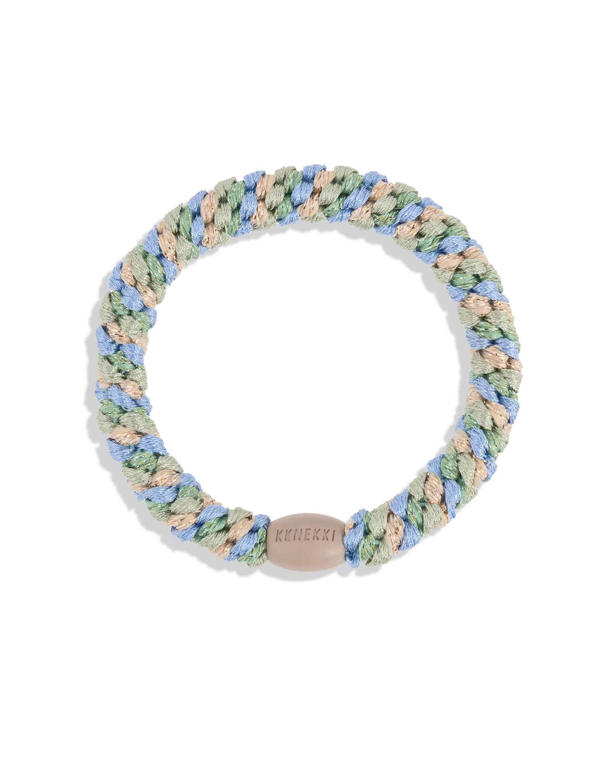 Craquez pour l’élastique KKNEKKI bleu ciel pistache pailleté, l’accessoire incontournable pour attacher vos cheveux sans les abîmer. Doux, durable et élégant, il apporte une touche de brillance à toutes vos coiffures.