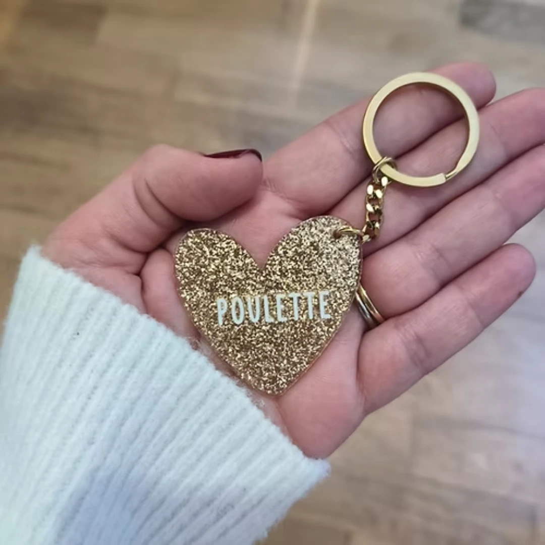 Affirmez votre style avec le porte-clés Poulette, un adorable bijou à accrocher à vos clés ou à votre sac. Ce porte-clés se démarque avec son joli design en acrylique en forme de cœur. Son inscription « POULETTE » ajoute une touche de douceur et de complicité à votre quotidien.